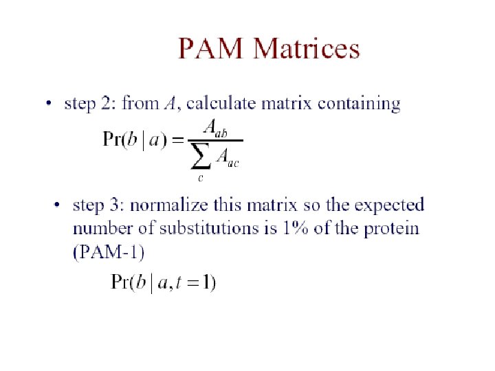 PAM model The scores derived through the PAM model are an accurate description of the information content (or the relative entropy) of an alignment (Altschul, 1991). PAM-1 corresponds to about 1 million years of evolution PAM-120 has the largest information content of the PAM matrix series PAM-250 is the traditionally most popular matrix