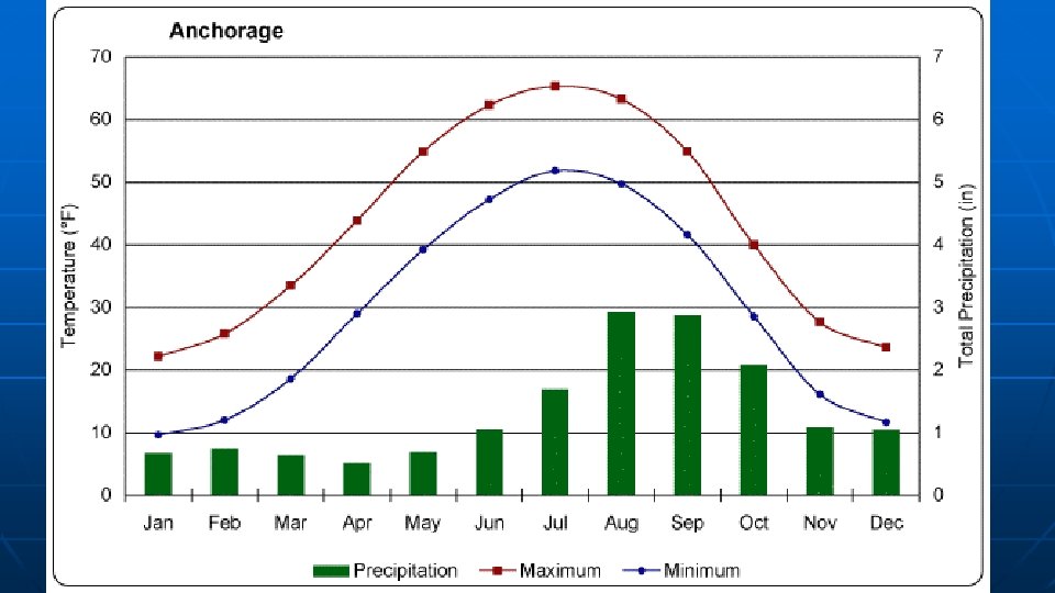 Climographs n The precipitation pattern is shown by the bar graph • For each month, they average the amount of precipitation received for 100 or more years (as long as they have been keeping records) • What you get is a general pattern of yearly precipitation – do all months get about the same amount? Are there wet months and dry months. • You also get the average yearly total amount of precipitation. • What you don’t get was the driest for that month and what year was the wettest. What was the lowest yearly total and what was the highest yearly total.