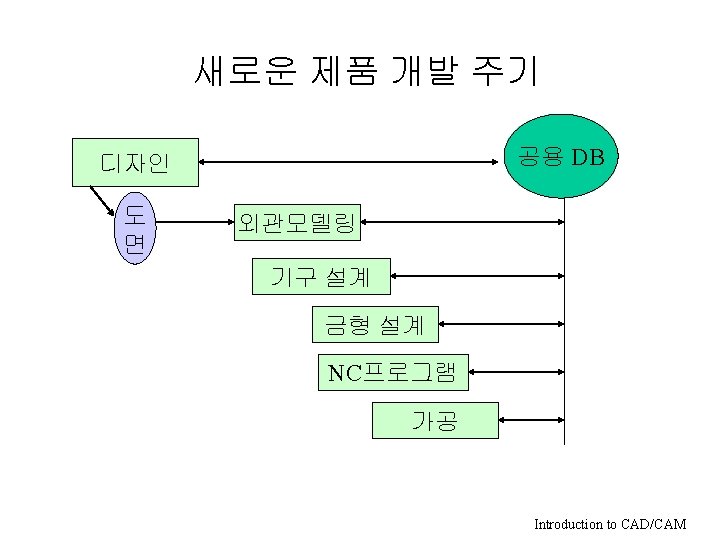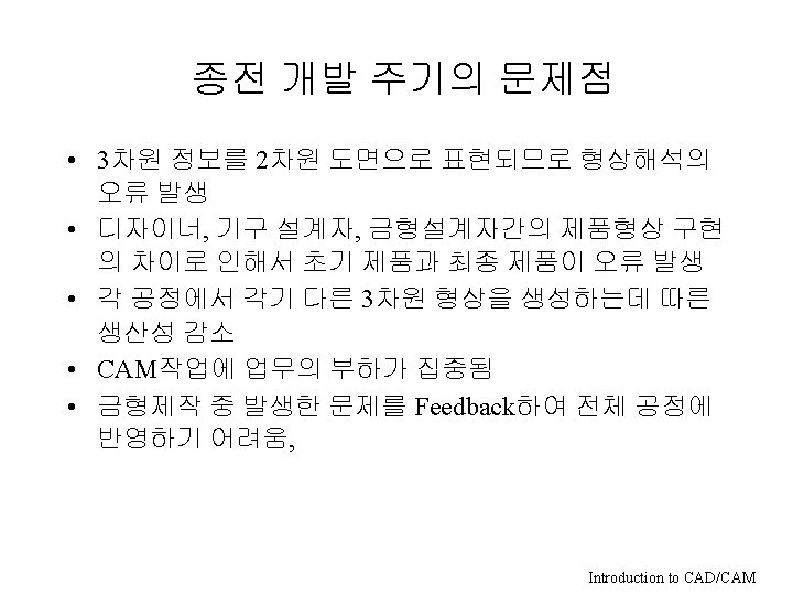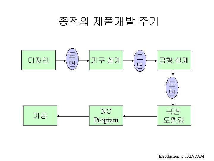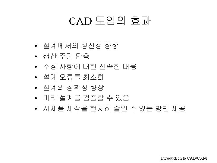 CAD/CAM의 분류 • 기능에 의한 분류 – – – 제도(drafting) 자동설계(Automatic design) CAD CAM CAE • 모델링 방법에 의한 분류 – – 2차원 제도 Wireframe Surface Modeling Solid Modeling • Hardware에 의한 분류 – – Main Frame Mini Computer Engineering Work Station PC Introduction to CAD/CAM