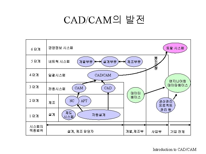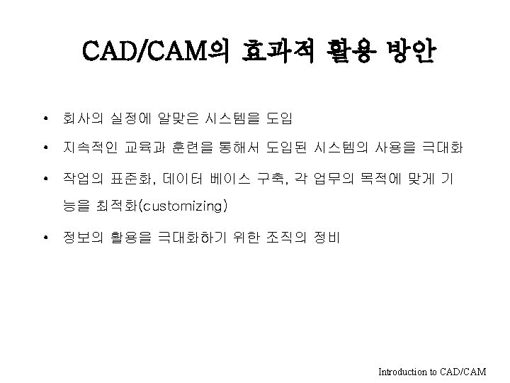 Introduction to CAD/CAM • • CAD/CAM의 정의 CAD/CAM의 발전 CAD/CAM의 분류 구성 CAD/CAM을 이용한 작업 내용 CAD/CAM의 도입 효과 CAD/CAM의 활용 방안 전자제품의 CAD/CAM활용 사례 Introduction to CAD/CAM