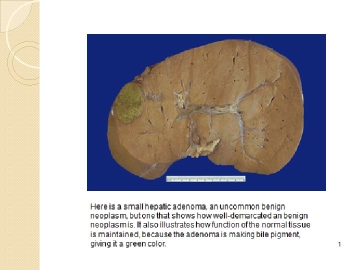 This is an example of metastases to the liver. Note that the tan-white masses are multiple and irregularly sized. A primary neoplasm is more likely to be a solitary mass. Metastasis is the best indication that a neoplasm is malignant.
