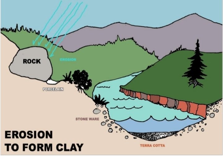 Ceramics • Things made from clay, the basic material for all ceramic creations. • Clay is created as a result of the decomposition of igneous rock, which makes up the entire earth’s crust. • Everything you will do with clay involves the interplay of these 3 variables: – Moisture – Plasticity – Heat