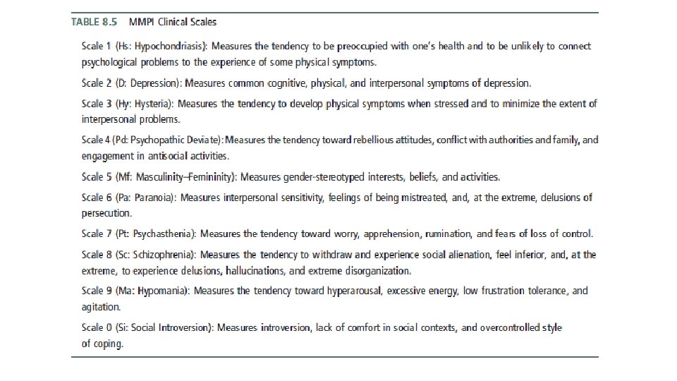 Self-report personality measures • the Minnesota Multiphasic Personality Inventory (MMPI) • For adults (MMPI‐ 2) & adolescents (MMPI‐A) • Keyed to DSM conditions, the Millon Clinical Multiaxial Inventory‐III (for adults) and the Millon Adolescent Clinical Inventory (for adolescents) • The Personality Assessment Inventory (PAI)