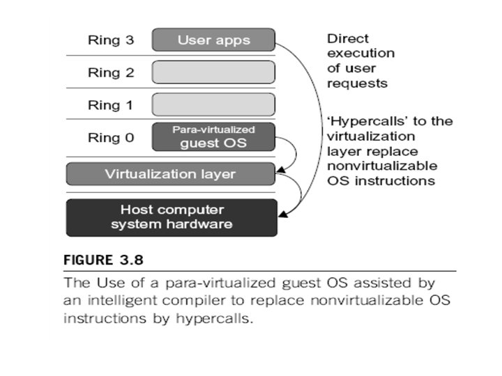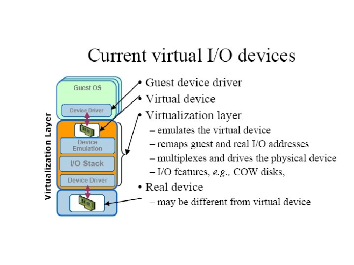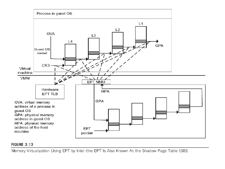 Conclusions on CPU, Memory and I/O Virtualization : § CPU virtualization demands hardware-assisted traps of sensitive instructions by the VMM § Memory virtualization demands special hardware support (shadow page tables by VMWare or extended page table by Intel) to help translate virtual address into physical address and machine memory in two stages. § I/O virtualization is the most difficult one to realize due to the complexity if I/O service routines and the emulation needed between the guest OS and host OS.