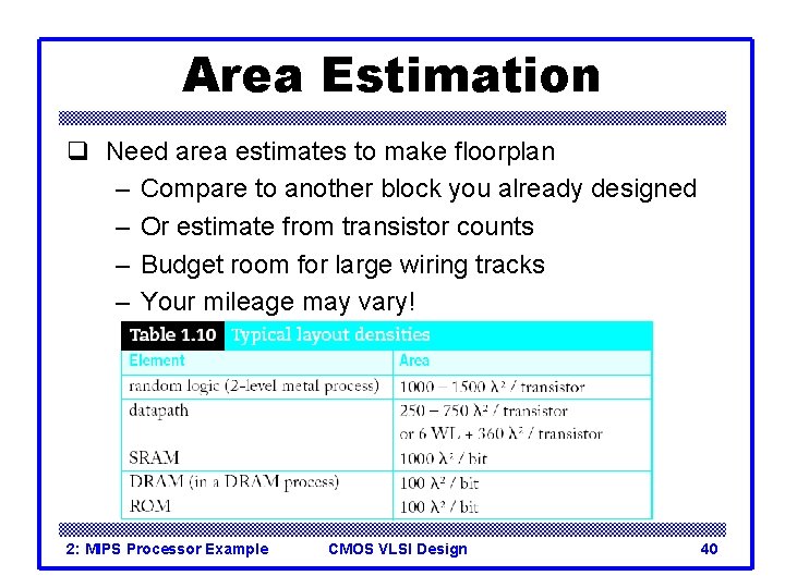Area Estimation q Need area estimates to make floorplan – Compare to another block you already designed – Or estimate from transistor counts – Budget room for large wiring tracks – Your mileage may vary! 2: MIPS Processor Example CMOS VLSI Design 40