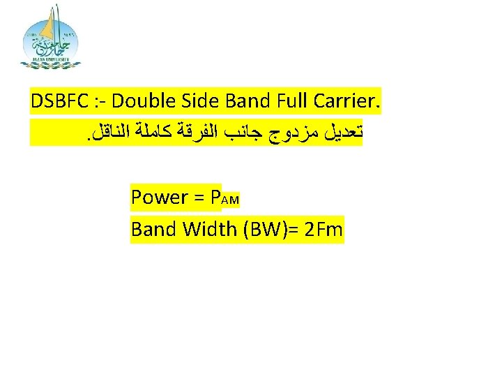 DSBSC : - Double Side Band Suppressed Carrier. . ﺿﻌﻒ ﺍﻟﺠﺎﻧﺐ ﺑﺎﻧﺪ ﺍﻟﻤﻜﺒﻮﺕ ﺍﻟﻨﺎﻗﻞ Power = PAM 3 Band Width (BW)= 2 Fm