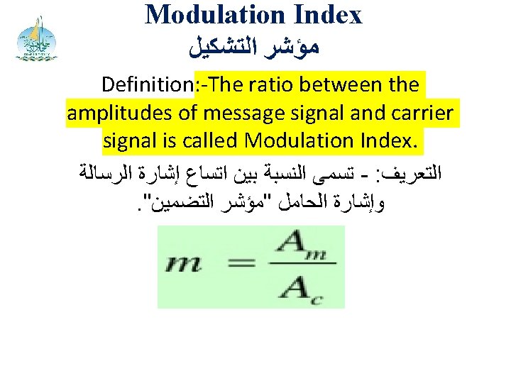 Equations. ﻣﻌﺎﺩﻻﺕ Modulating Signal: Carrier Signal : AM Signal : -