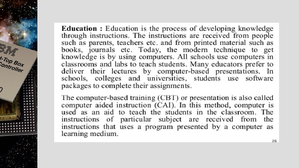 Advantage of computer • Easy processing of complex tasks. • It saves time by quick manipulation of data as compared to when done manually. • The errors in data processing are minimized when a computer is used. • It has helped in making communication easier by using internet. • It stores, retrieves, and processes a large amount of data. • It helps in multitasking of various jobs.