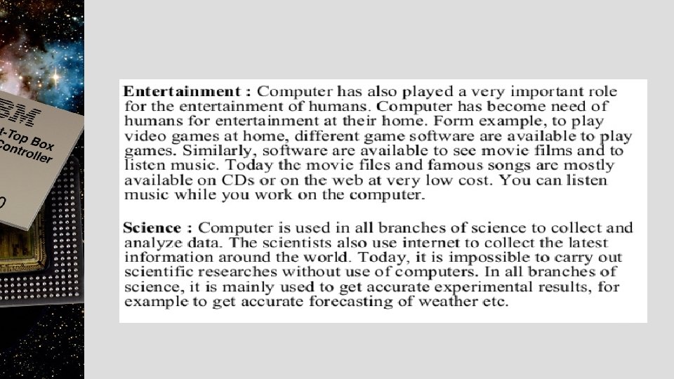 Application of computer • Computer is playing very important role in every field of life. • Computers are everywhere such as at home, at school. • In daily life a large number of activities are dependent on computers. • The main fields where computer is playing very important role are: