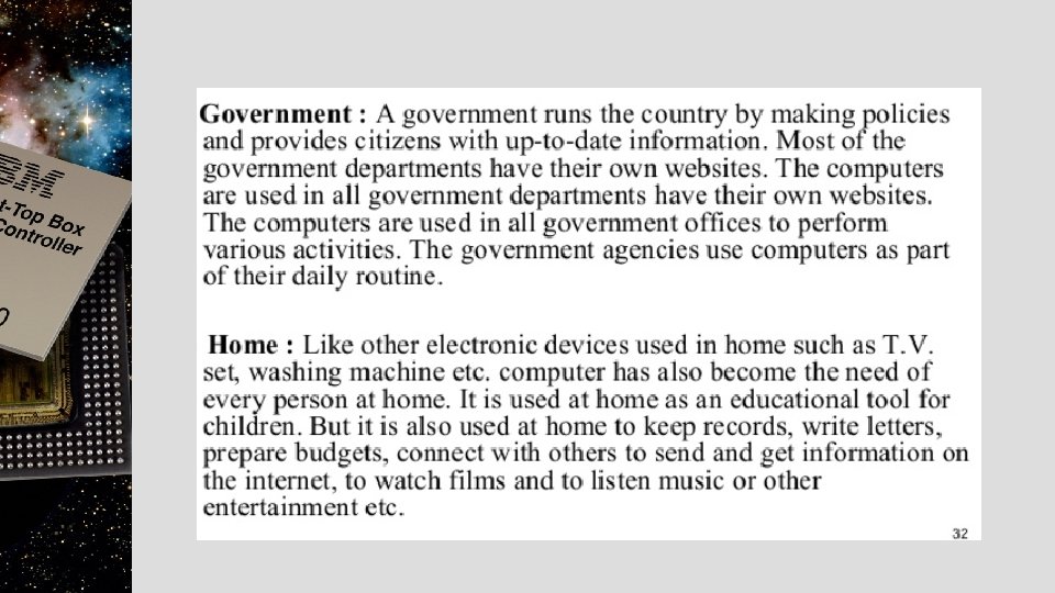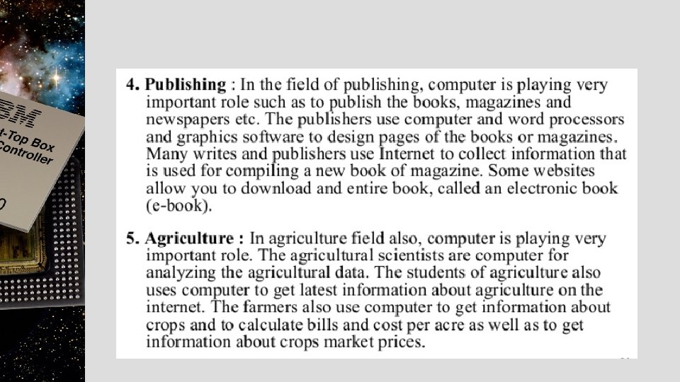 Disadvantage of computer • • Un-Employment Cyber-crime Computer can perform only what is it programmed to do. Computer need well defined instructions to perform any operation