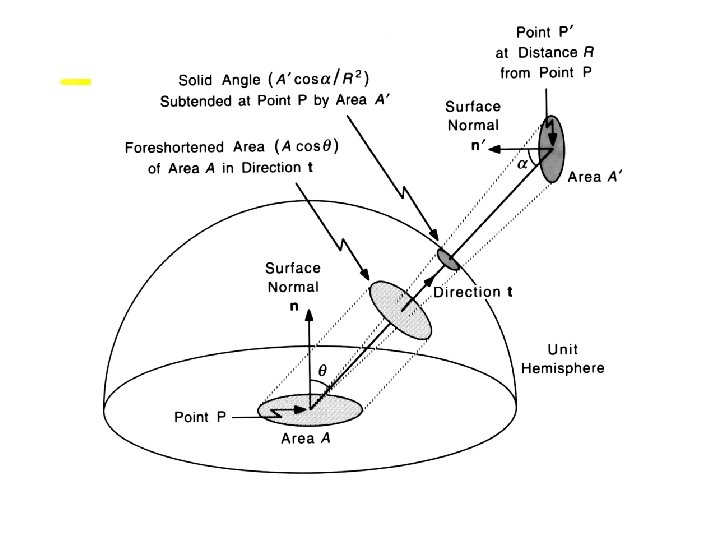 Foreshortening • Principal of foreshortening – When a patch of area A is tilted at an angle with respect to a distant view point p, it appears to have an area A cos • This is true for viewing a light source from the point of view of a surface patch; and also for viewing a surface patch from the point of view of a light source