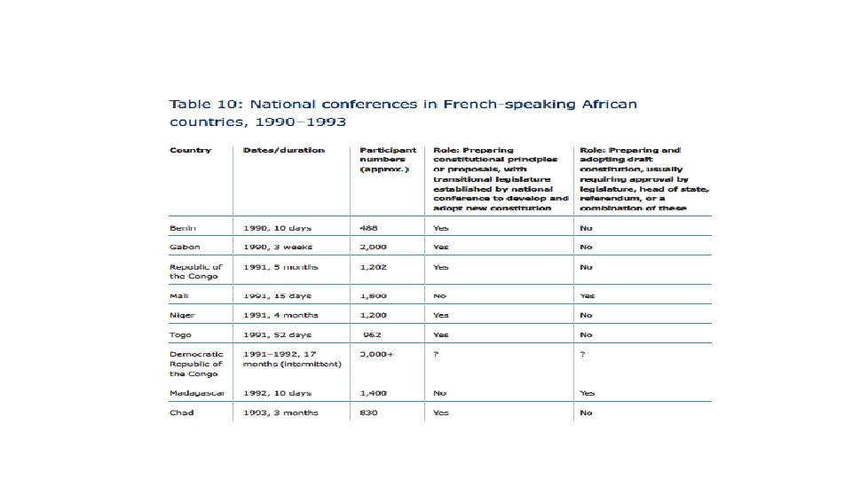 4. National Conventions • National conventions were heavily used in Francophone Africa in the late 1980 s and early 1990 s to deal with popular calls for liberalisation and democratisation; • Participants in national conventions were, unlike constituent assemblies, unelected; • Described as multi-purpose bodies [Interpeace], they did not always function as constitution-making bodies; • Some Conventions provided transitional legislatures only with guiding principles for the new constitution to adhere to; • Most stipulated that constitutions be ratified by referendum;