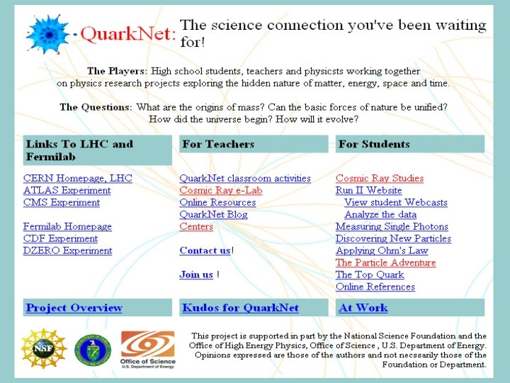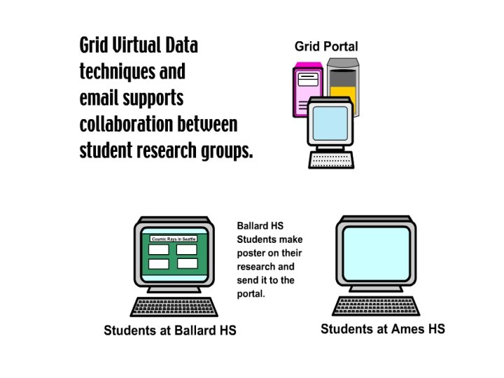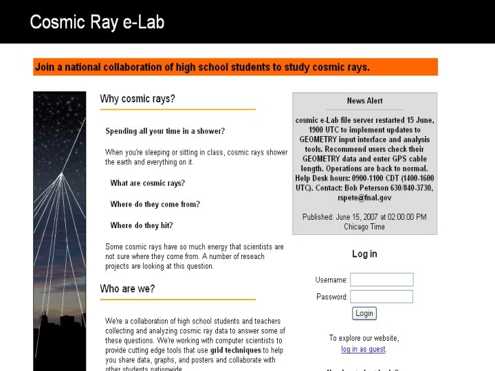 Why put cosmic ray detectors in schools? • Important open questions about extremely high energy (UHE) cosmic rays: – Where do cosmic rays with E>1020 e. V come from? – How can they be produced and accelerated? – How can they reach us through intergalactic space? • UHE-CR research requires simple detectors, spread over a large area, with accurate time synchronization • High cost for conventional physics experiment: new equipment, land use, data networks, and site support – Example: Auger Project: > US$ 108 • Solution: Physicists provide surplus HEP equipment, schools provide sites and Internet port