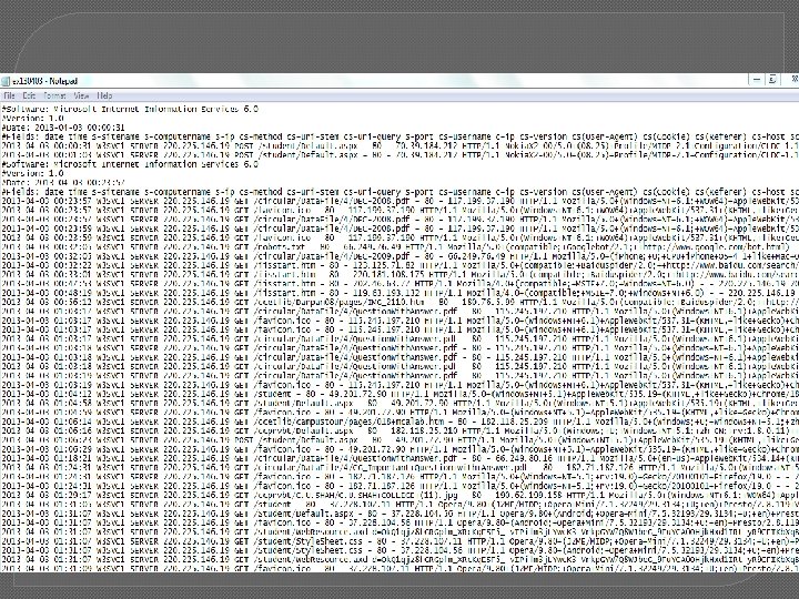 KDD Process on Web Log Data � � � � Cleaning: remove error logs Integration: multiple logs may be combine Selection: Data having valid Status and Media type is selected Transformation: Transfer data to day wise, week wise Data Mining: Identify Pattern and count frequent access Pattern Evaluation: Display frequently access sequences Knowledge Presentation: url page wise user count graph, IP address wise number of page visited count graph