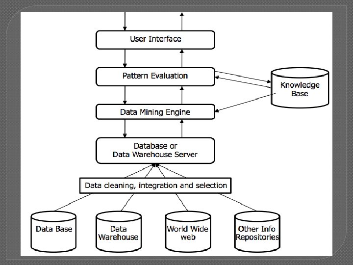 Data Mining Architecture �Components 1. Databases, Data warehouse, World Wide Web or other Information repository 2. Database or Data warehouse server 3. Knowledge base 4. Data mining engine 5. Pattern Evaluation Module 6. User Interface