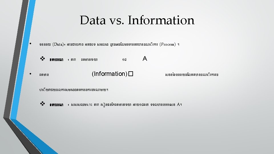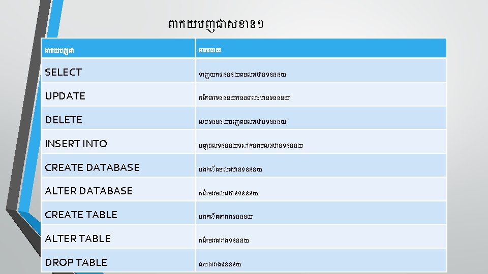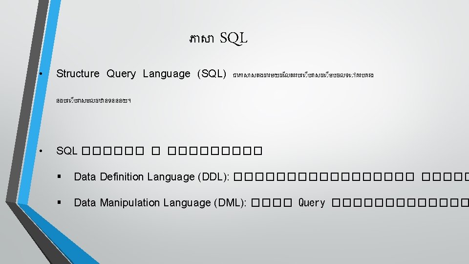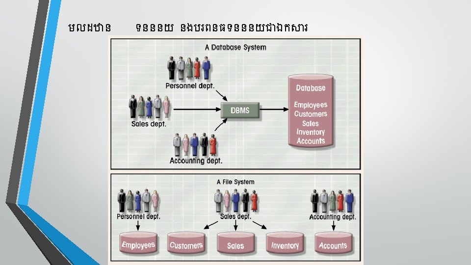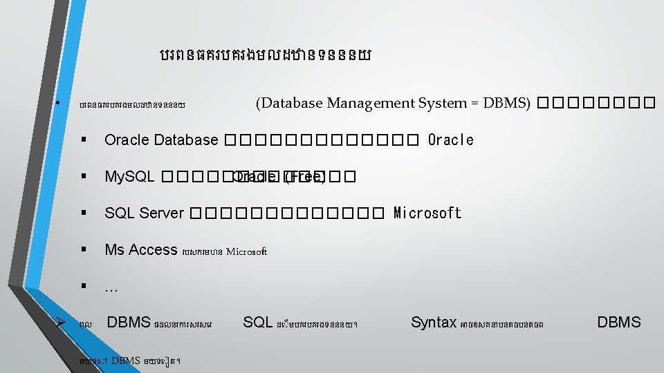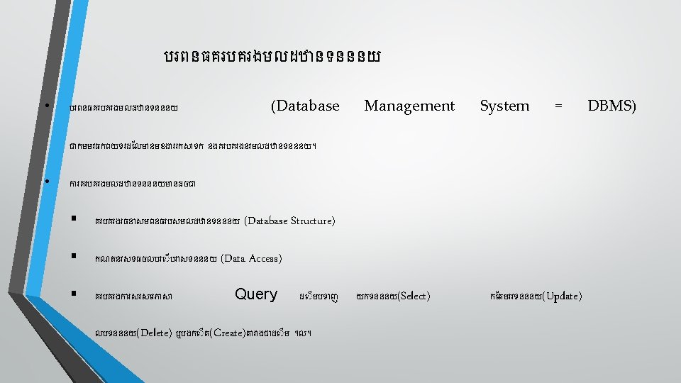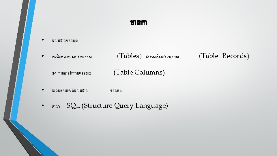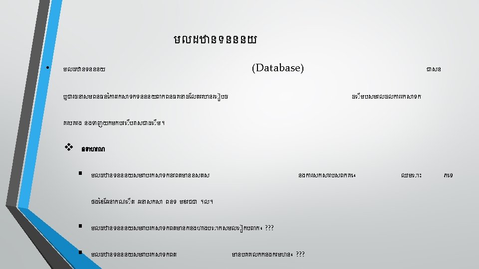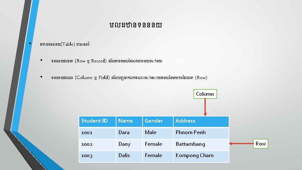 មលដឋ នទនននយ • យ ងអ ចនយ យប នមយ ងទ តថ មលដឋ នទនននយ (Database) ជ សន ដ លព កពនធគន ។ ន ត រ ងទនននយ(Table) Table Name: tbl. Scores Table Name: tbl. Students Student. ID Name Gender Address 1001 Dara Male Phnom Penh 1002 Lena Female Battambang 1003 Dalis Female Kompong Cham Score. ID Stu. ID Subject. ID Score 1 1001 CS 101 92 2 1001 CS 102 94 3 1002 CS 101 93 4 1002 AC 101 95 Subject. ID Subject. Name Department CS 101 Web Design 1 Computer Science CS 102 Web Design 2 Computer Science AC 101 Basic Accounting Acounting Table Name: tbl. Subjects