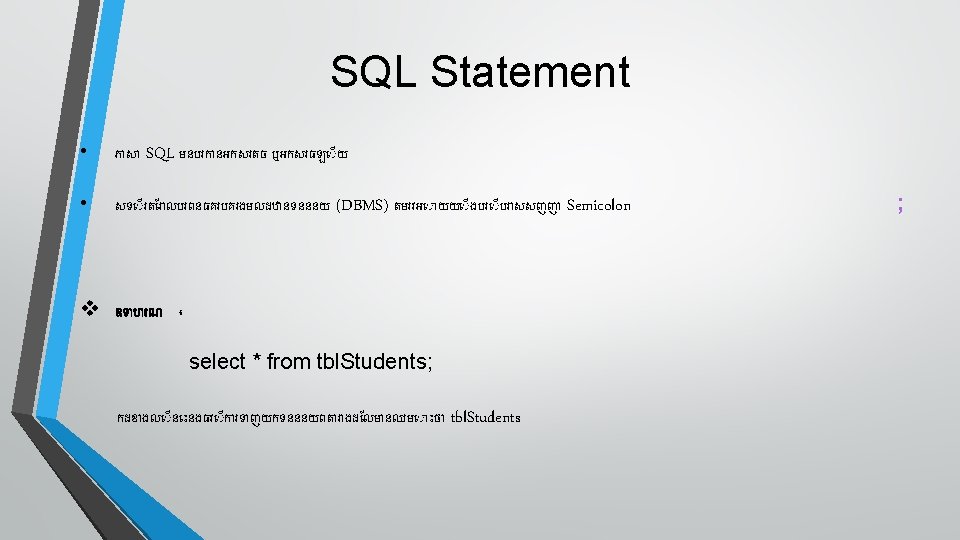 SELECT Statement • SELECT ������������������ SELECT column_name 1, column_name 2 FROM table_name; ឬ SELECT * FROM table_name; v ឧទ ហរណ ៖ o SELECT * FROM tbl. Students; o SELECT studentid, name FROM tbl. Students; o SELECT stubjectid, subjectname, department FROM tbl. Subjects;