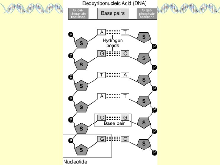 Double strands of DNA are held together by hydrogen bonds. • The DNA molecule is usually doublestranded, with the sugar-phosphate backbone on the outside of the helix. • In the interior are pairs of nucleotide bases, holding the two strands together by hydrogen bonds. • Hydrogen bonding between the bases is specific. The adenine base can pair only with the thymine base, and the guanine base can only pair with the cytosine base.