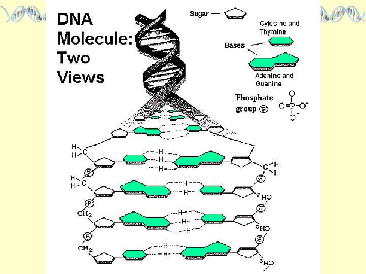 What Watson and Crick Knew Main components of DNA: • Phosphates • Sugars • Four nitrogenous bases – – Adenine Thymine Cytosine Guanine • Using wire and pieces of metal, Crick and Watson began building scale models of DNA.