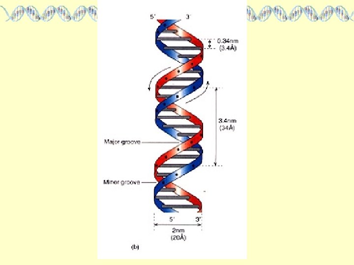 DNA Structure as a Ladder • The curving sides of the ladder of DNA represent the sugar phosphate backbone. • The rungs are the base pairs. • The spacing between the base pair rungs is 3. 4 Å (Angstroms are 1 -10 or 1/10, 000, 000 of a meter or 1/10 nanometer). • The helix repeat distance is 34 Å, meaning there are 10 base pairs per turn of the helix. • The strands are antiparallel. If one has 5’ to 3’ polarity from top to bottom, the other must have 3’ to 5’ polarity from top to bottom. • The helix is 20 Å across at the base.