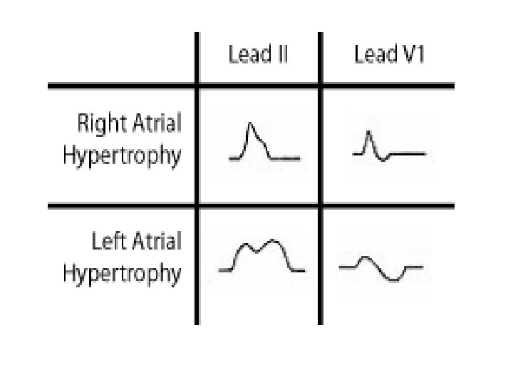 Hypertrophy criteria are fairly straightforward; we will be looking for enlargement of any of the four chambers. 1. LVH: (Left ventricular hypertrophy). Add the larger S wave of V 1 or V 2 (not both), measure in mm, to the larger R wave of V 5 or V 6. If the sum is > 35 mm, it meets "voltage criteria" for LVH. Also consider if R wave is > 12 mm in a. VL. LVH is more likely with a "strain pattern" which is asymmetric T wave inversion in those leads showing LVH. 2. RVH: (Right ventricular hypertrophy). R wave > S wave in V 1 and R wave decreases from V 1 to V 6. 3. Atrial hypertrophy: (leads II and V 1). Right atrial hypertrophy - Peaked P wave in lead II > 2. 5 mm amplitude. V 1 has increase in the initial positive deflection. Left atrial hypertrophy - Notched wide (> 3 mm) P wave in lead II. V 1 has increase in the terminal negative deflection.