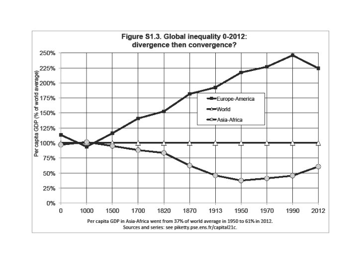 • (4) Rise of emerging countries certainly benefited from market openess, but did not come simply from market forces; in particular, foreign investment played a relatively minor role: convergence came from domestic saving and investment, public infrastructures and education, the diffusion of knowledge and state formation; e. g. bigger govt and public spend. in China than India, & higher growth; there are different ways to organize economic & political institutions • The standard growth model predicts output convergence, not income and convergence; if we simply rely on market forces (rather than investment in productivity, knowledge and education), we can end up with permanent wealth inequality, foreign-owned countries, political instability and redistribution cycles (Africa, South America) • International property relations are particularly complicated to regulate peacefully • Learning to live with inequality, collective learning about the ideal compromise & institutions: the dimensions of political conflict