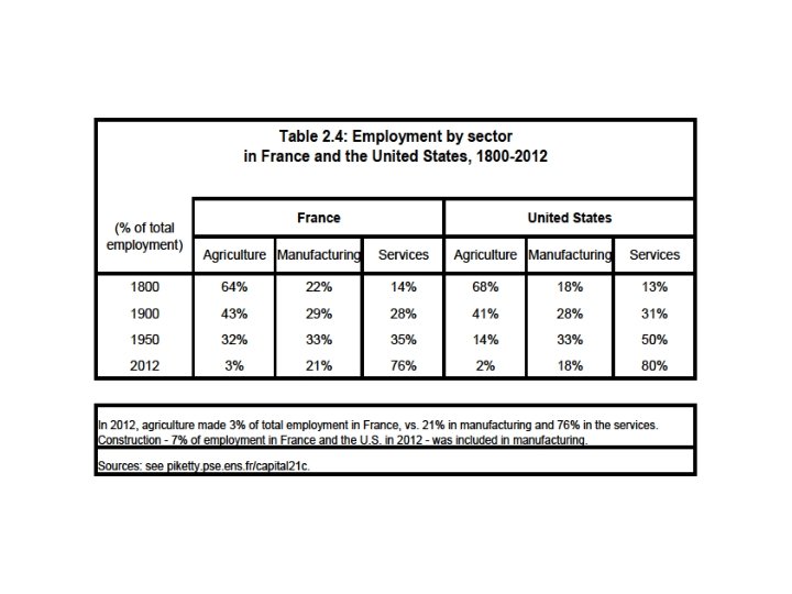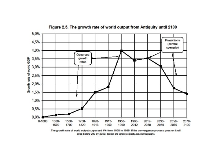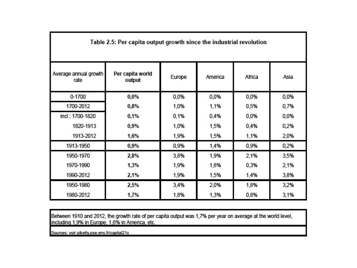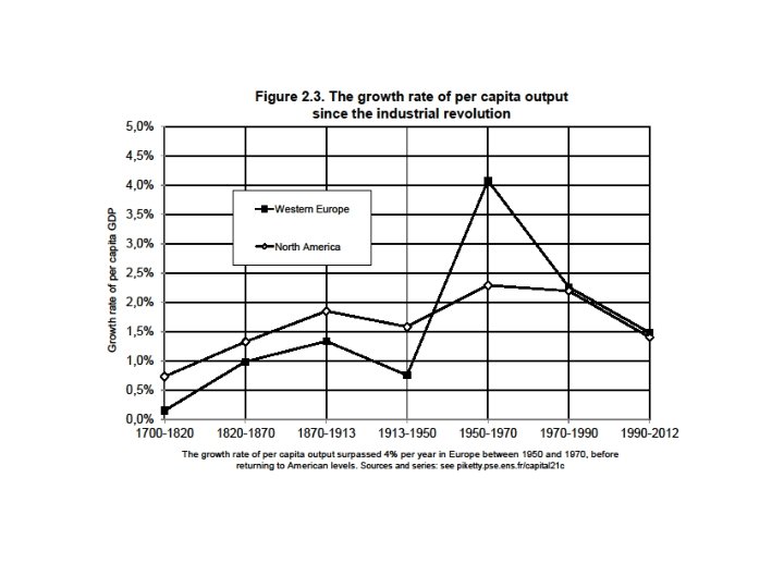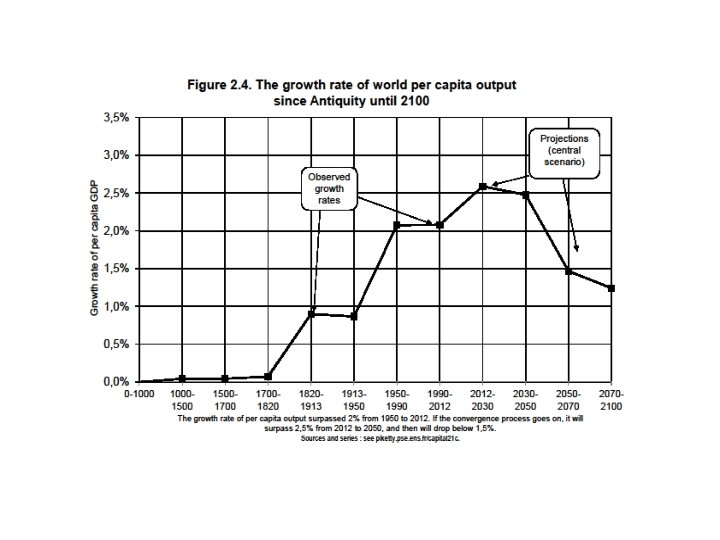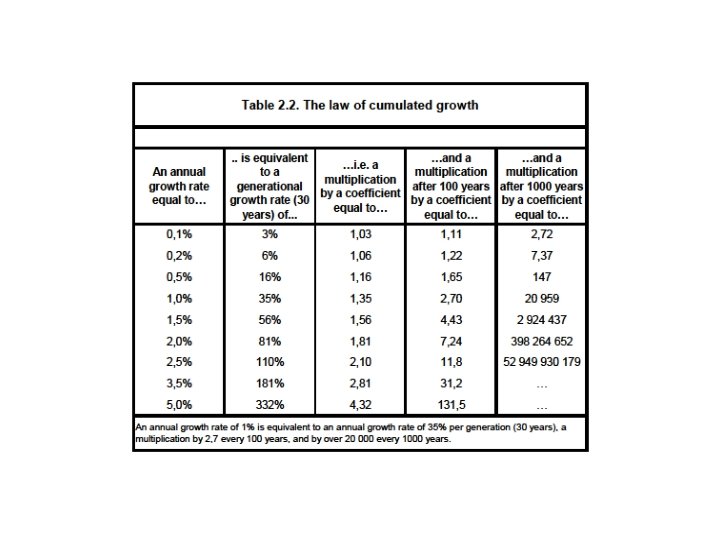 • Per capita (per inhabitant) growth was exceptionally high in Europe and Japan in the 1950 -1980 period (h=4 -5% per year) because of a catch-up process with the US; but since 1980, per capital growth rates have been low in all rich countries • In the very long, h=1% is already quite fast and requires permanent reallocation of labor (about one third of the economy is being renewed at each generation)