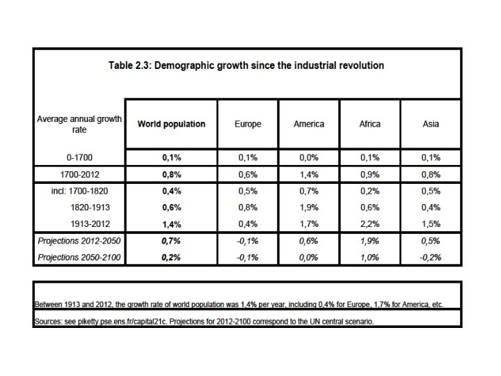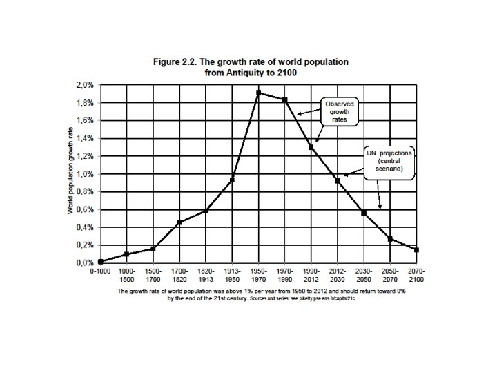 Fact 2. Growth slowdown • Productivity growth is always slow for countries at the world technological frontier; once global catch-up process is over, growth might be low everywhere • Population growth seems to be → 0 (or <0) • Average world growth 1700 -2012: g=1, 6%, including n=0, 8% for population and h=0, 8% for per capita output • But 0, 8% per year was enough to multiply world population (and average income) by a factor of 10 • g = n + h with n = population growth and h = productivity growth • In the very long run, maybe n ≈ 0% and h ≈ 1 -1, 5%, so that g=n+h≈1 -1, 5% • Some economists are even less optimistic: long-run g<1% according to Gordon 2012 and secular stagnation debate