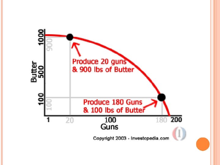 HOW DO COUNTRIES/FIRMS DECIDE WHAT THEY NEED TO PRODUCE? Productions possibilities frontier �Graph showing the maximum combinations of goods and services that can be produced from a fixed amount of resources in a given period of time. �Classic example is Guns or butter.