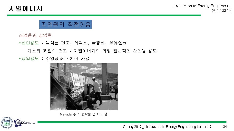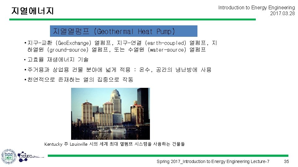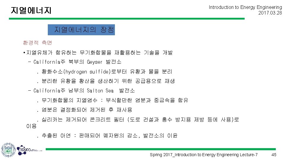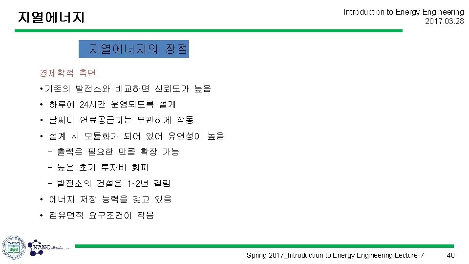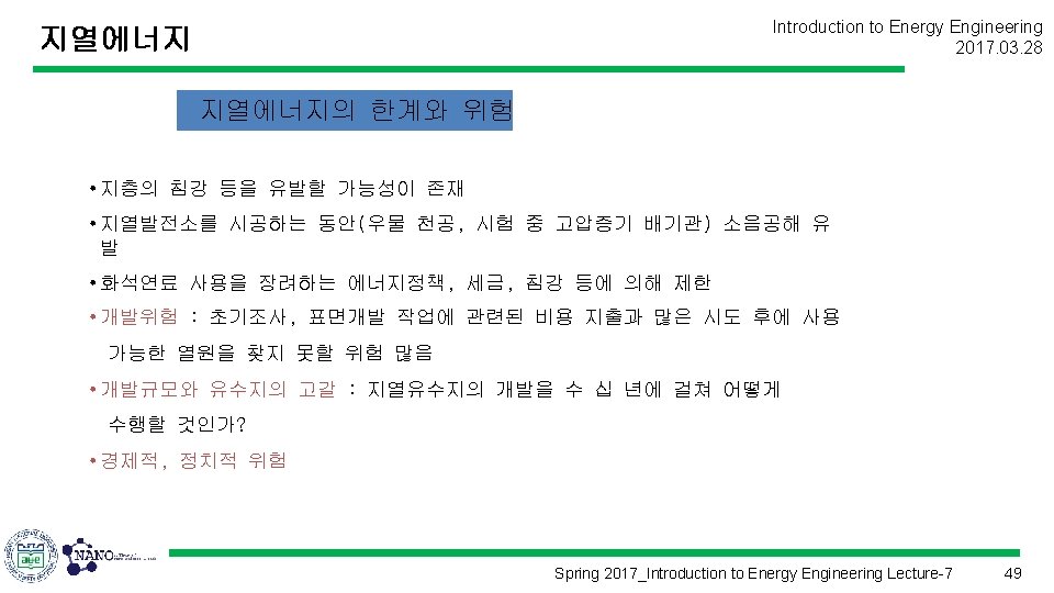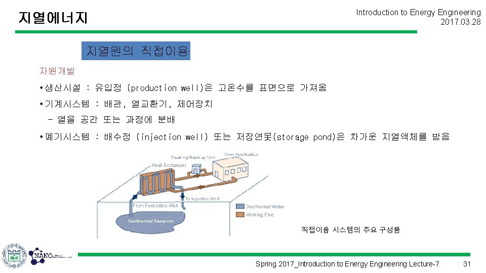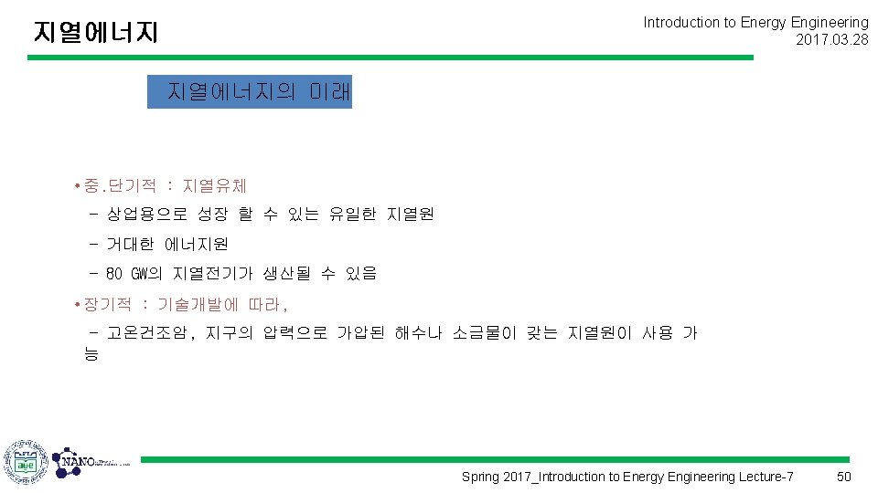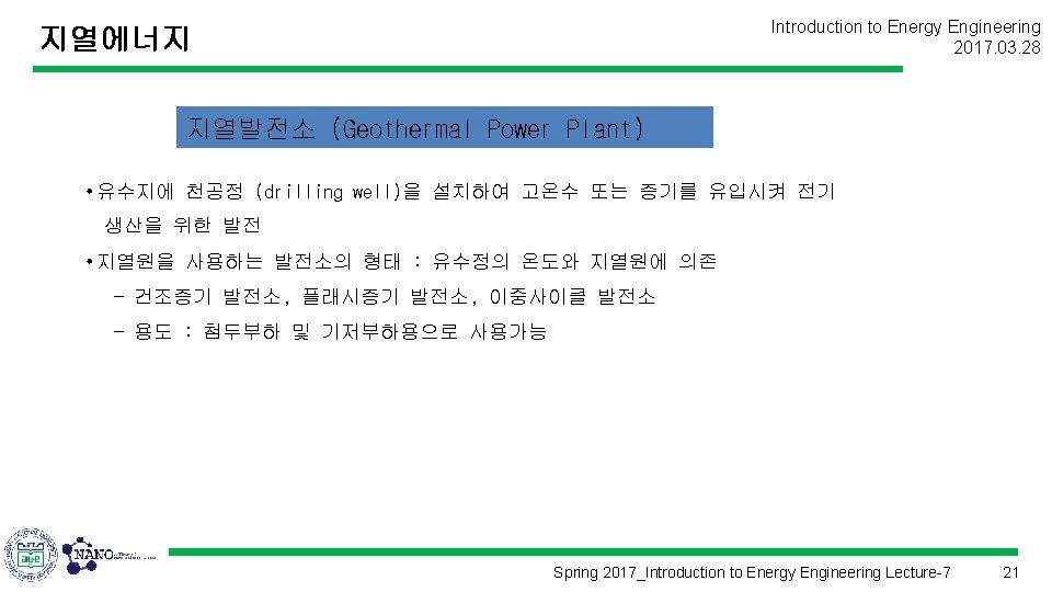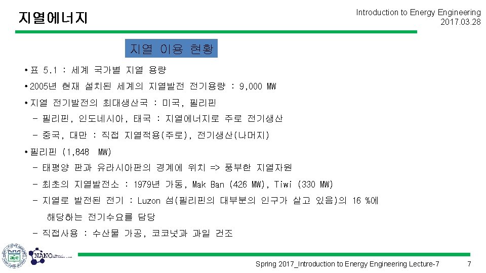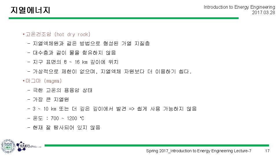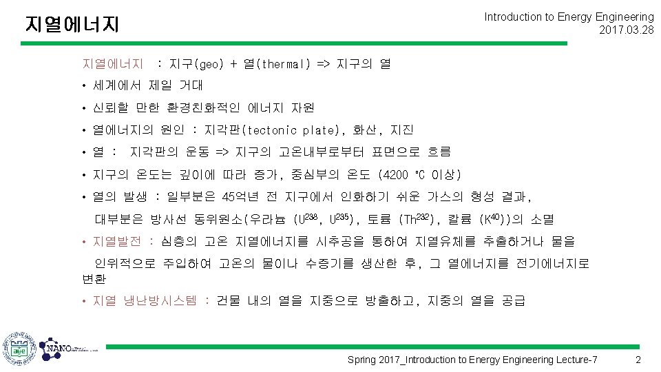 Introduction to Energy Engineering 2017. 03. 28 에너지공학개론 (Introduction to Energy Engineering) Lecture 7 지열에너지 Prof. Kim, Hyung Kook hkkim@pusan. ac. kr Dept. of Nano Energy Engineering Pusan National University Spring 2017_Introduction to Energy Engineering Lecture-7 1