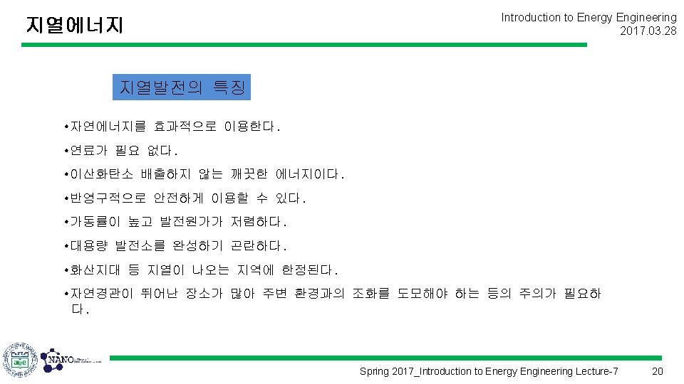 지열에너지 Introduction to Energy Engineering 2017. 03. 28 Spring 2017_Introduction to Energy Engineering Lecture-7 19