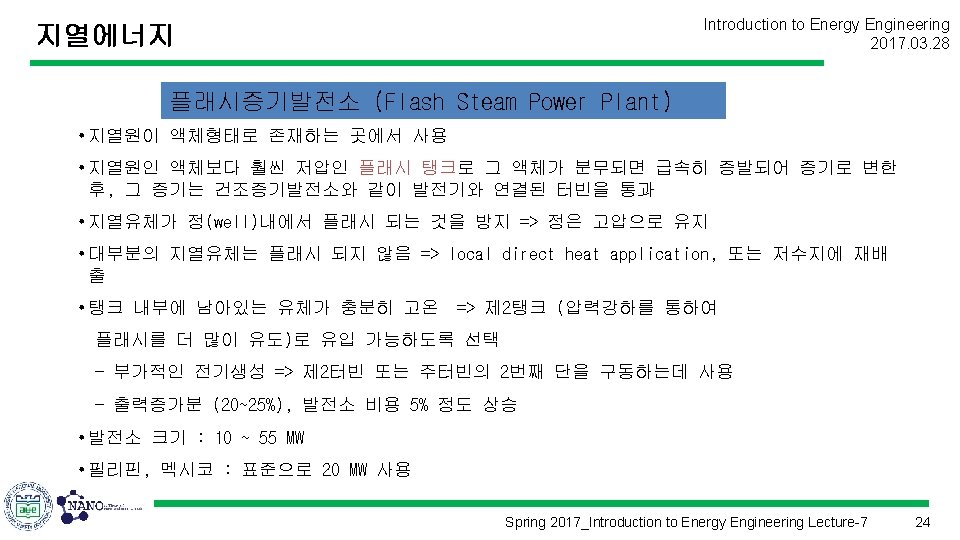 Introduction to Energy Engineering 2017. 03. 28 지열에너지 건조증기발전소 (Dry Steam Power Plant) • 인도네시아, 일본, 멕시코에서도 발견 • 미국 California Geyser는 세계의 가장 큰 지열발전원, 설치된 용량 (1, 100 MW) 건조증기발전소 Spring 2017_Introduction to Energy Engineering Lecture-7 23