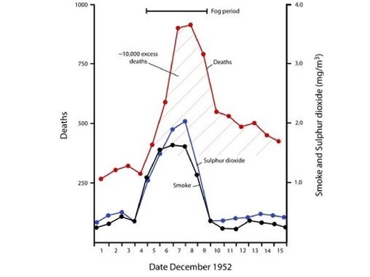 London Smog Disaster, 1952 Air pollution causes respiratory illnesses and death … When fog and soot from coal burning created a dense smog in Winter, 1952, in London, the smog was around for five days from December 5– 10, 1952 There was a substantial increase in mortality The death rate in London in the previous week was around 2, 062 In the week of the smog, 4, 703 died