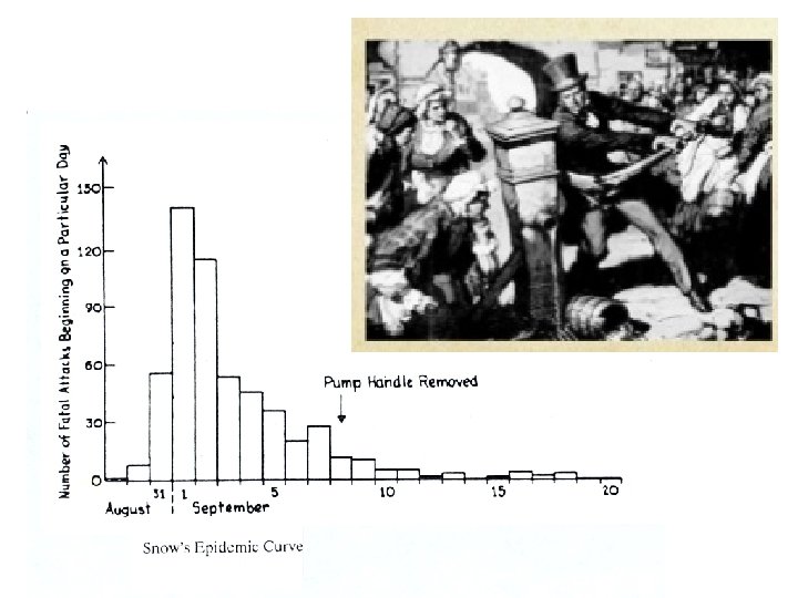 John Snow (1813– 1858) An English physician and modern -day father of epidemiology • He used scientific methods to identify the cause of the epidemic of cholera in London in 1854 • He believed that it was the water pump on Broad Street that was responsible for the disease The removal of the pump handle ended the outbreak