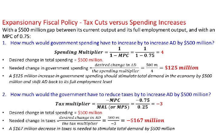 Expansionary Fiscal Policy – Impact on Deficits and Debt To achieve a particular increase in AD, taxes would have to be CUT by more than spending would have to INCREASE. There is a reason for this: • A tax cut is an INDIRECT injection into the nation’s economy. Ø A tax cut increases the disposable incomes of households Ø Higher disposable incomes leads to more consumption, but also increases savings and imports, both leakages. Ø The actual increase in spending, therefore, is less than if the government were to increase AD directly through new government spending. • Fiscal stimulus (both tax cuts and spending increases) lead to a budget deficit Ø Assuming a government started with a balanced budget, if it wanted to stimulate AD, the government would have to incur a deficit. Ø A tax cut will require the government incurs a LARGER deficit in order to stimulate AD by a certain amount than a spending increase.