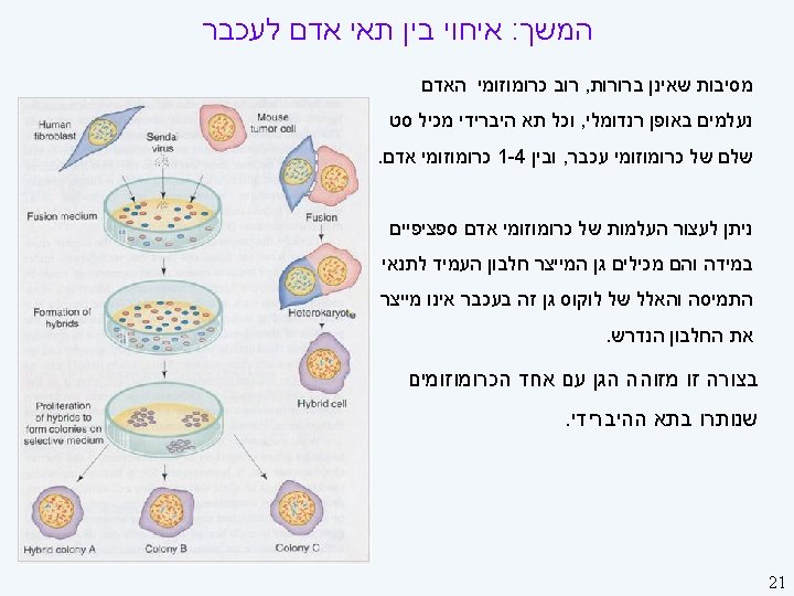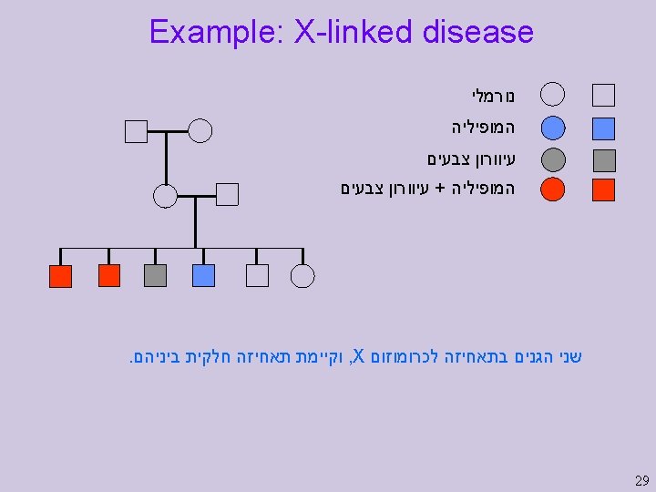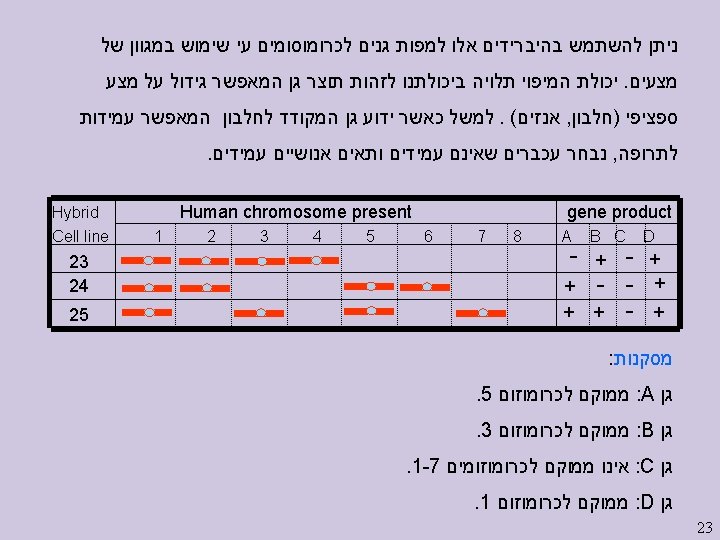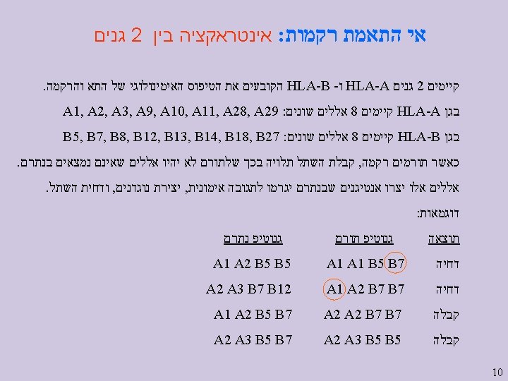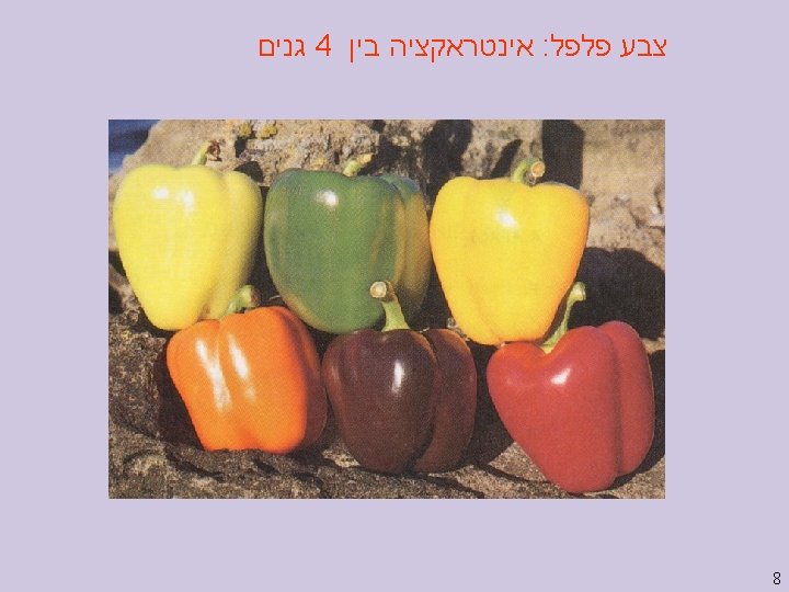 גנים 4 אינטראקציה בין : צבע פלפל Y : removal of green chlorophyll from fruit y : green chlorophyll in fruit R : Red carotenoid pigment r : yellow carotenoid pigment C 1; C 2 : Two genes with the same function, determine amount of carotenoids. c 1; c 2 : Recessive mutations, lower the amount of carotenoids. Genotype Phenotype r/r C 1/C 1 C 2/C 2 y/y green R/R C 1/C 1 C 2/C 2 Y/Y red R/R C 1/C 1 C 2/C 2 y/y brown r/r C 1/C 1 C 2/C 2 Y/Y yellow R/R C 1/C 1 c 2/c 2 Y/Y orange r/r c 1/c 1 c 2/c 2 Y/Y white 9