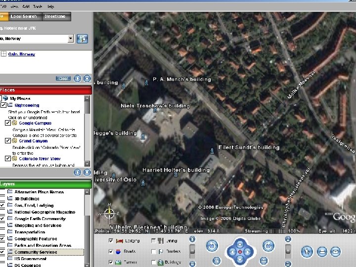 Google Earth n n n n Offers maps and satellite images for complex or pinpointed regional searches. Fly from space to your neighborhood. Type in an address and zoom right in. Search for schools, parks, restaurants, and hotels. Get driving directions. Tilt and rotate the view to see 3 D terrain and buildings. Save and share your searches and favorites. Add your own annotations.