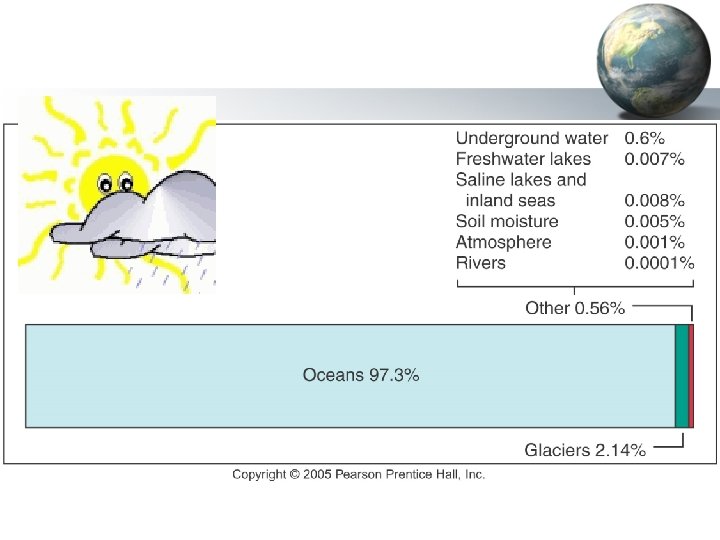 Water: Where is it? • • • 96. 5% stored in oceans 2% stored in glacial ice 0. 9% is saline groundwater 0. 8% available as fresh water 0. 014% in rivers and lakes 0. 001% is contained in the atmosphere 11