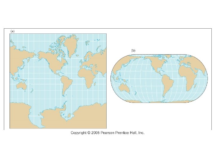 Projection n Scientific method of transferring locations on Earth’s surface to a flat map (“orange peel” concept). (Goode’s Interrupted Projection). n 4 types of distortion – see maps on next slide. ¡ Relative size and distance (Mercator). Here, shape is fine, but size is not, esp. at the poles. So the scales are different (see Greenland). Also called “conformal” maps. ¡ Shape and direction (Equal Area projection). These are maps that distort shape but preserve size.