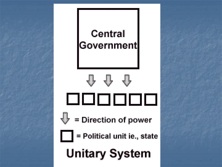 Unitary System of Government Key Facts n Most governments in the world are unitary n Most power is held by a central (National) government n Local governments are given power from the central government Example: England