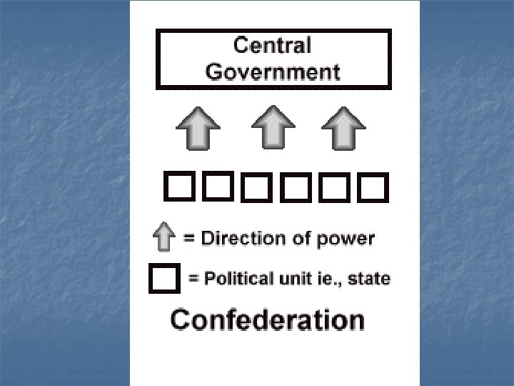 Confederation System of Government n Key Facts Independent states have a lot of power and tell the Central Government what it is allowed to do n The Central Government is weak Examples: USA under Articles of Confederation, Civil War South Serbia until 2006 n