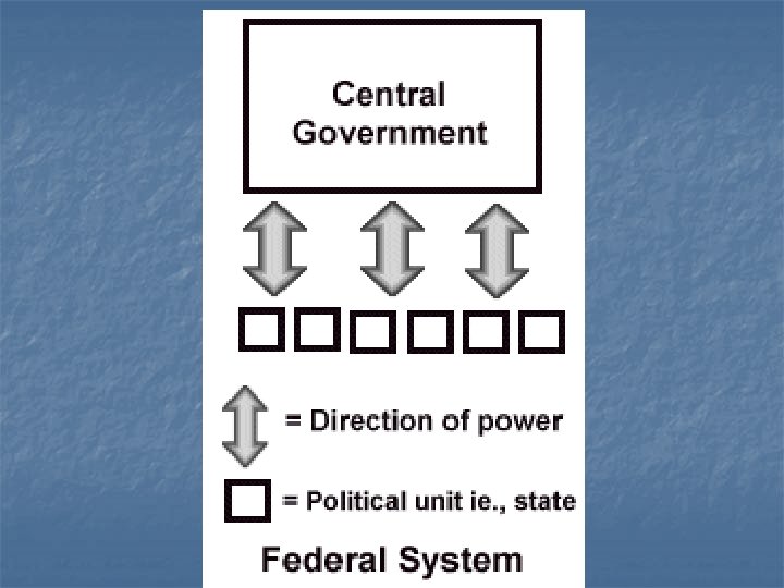 Federal System of Government n n Key Facts: a number of states form into a union Power is divided between central government and local governments Government acts directly with the people Example: United States