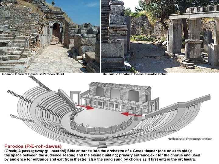 The Greek Theatre l Theatron = area of seats for the audience hollowed out from the hillside l Orchestra = large area in front of the stage where the chorus sang and danced l Thymele = the altar centered in the orchestra used for sacrifices to Dionysus l Parados = walled walkway used by the chorus to enter and exit the stage l Pro-scenium = a long, low stage behind the orchestra l Skene = building that contained the actors’ dressing rooms
