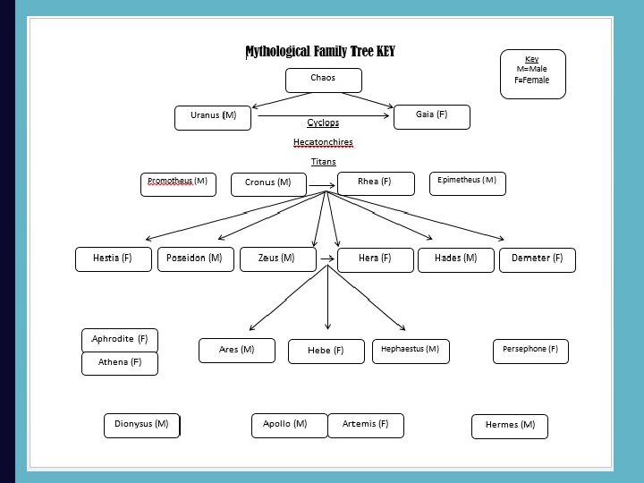 AS I PRESENT: • Record the name of each God/Goddess in the blank family tree provided • Please include an “M” beside the name if the individual is male • Please include an “F” beside the name if the individual is female • Beside/under each name jot down a brief description of the God/Goddess. (BE BRIEF- We will explore them in detail later this week as our first embedded assessment).