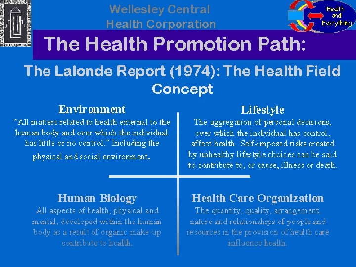 Canadian Contributions I • Lalonde Report - 1974 A New Perspective on the Health of Canadians • Health Field Concept: – Human Biology – Lifestyle – Environment – Health Care