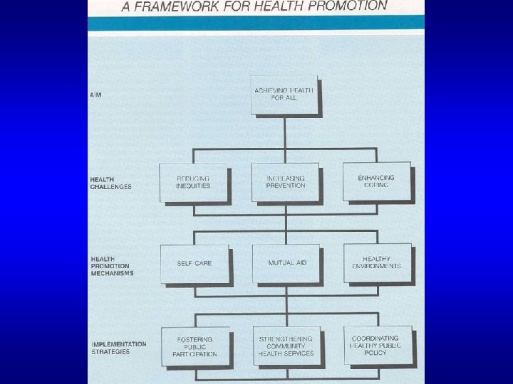 The Ottawa Charter for Health Promotion – World Health Organization, 1986 • Health is a positive concept emphasizing social and personal resources as well as physical capacities • Health Promotion is the process of enabling people to increase control over, and to improve their health • Prerequisites for Health are peace, shelter, education, food, income, stable ecosystem, sustainable resources, social justice and equity • Health Promotion Actions are: building healthy public policy, creating supportive environments, strengthening community action, developing personal skills, reorienting health services