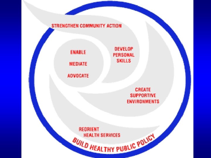 Concepts of Health Promotion: Behavioural Approach II • Principal Strategies: health education, social marketing, advocacy for public policies supporting lifestyle choices (e. g. smoking bans, low fat meat production, bicycle paths, ad bans) • Target: high risk groups, children and youth • General Approach: individualized, elements of societal focus as related to public policy • Actors: public health workers, illness‑related advocacy groups (e. g. , Cancer Society), governments •