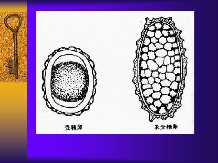 ¨ Egg: There are three kinds of the eggs. They are fertilized eggs, unfertilized eggs and decorticated eggs. We usually describe an egg in 5 aspects: size, color, shape, shell and content. 1. Fertilized eggs: broad oval in shape, brown in color, an average size 60× 45µm. The shell is thicker and consists of ascaroside, chitinous layer, fertilizing membrane and mammillated albuminous coat stained brown by bile. The content is a fertilized ovum. There is a new-moon(crescent) shaped clear space at the each end inside the shell. 2. Unfertilized egg: Longer and slender than a fertilized egg. The chitinous layer and albuminous coat are thinner than those of the fertilized eggs without ascaroside and fertilizing membrane. The content is made of many refractable granules various in size. 3. Decorticated eggs: Both fertilized and unfertilized eggs sometimes may lack their outer albuminous coats and are colorless.