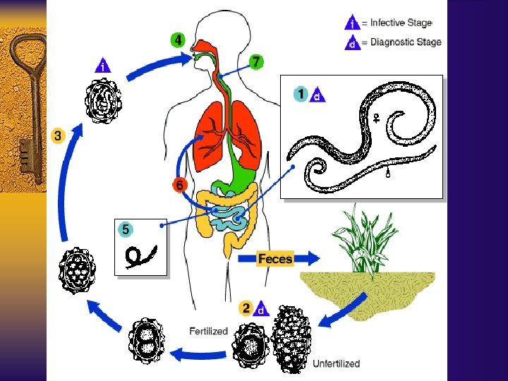 swallowed digestive Infective eggs small intestine Larvae hatch out juice act penetrate intestine mucosa Right heart Lymphatic or venules lungs Bronchiles penetrate the alveolar wall Bronchi discharged with sputum Pharynx return to Small intestine discharged Fertilized eggs in feces Out side of the body Embryonated eggs(infective eggs) Liver molt 2, 3 Alveoli Trachea die molt 4 Adults 25 -30℃, moisture 2 -3 weeks, molt 1