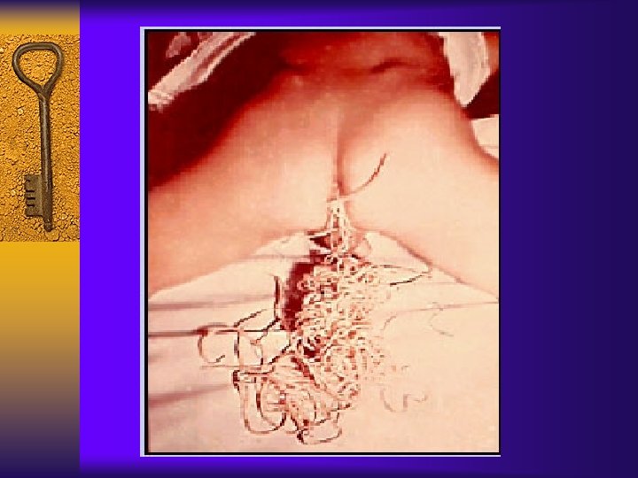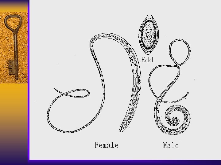 Trichuris trichiura ( Whipworm) Morphology: ¨ Adult: The worm looks like a buggy whip, the anterior 3/5 is slender and the posterior 2/5 is thick. It is pinkish gray in color. The female worm is 3 -5 cm in length and has a long slender esophageal region. The male is smaller than the female and has a curved tail. The reproductive organs of male and female are all double tubule. ¨ Egg: It is barrel or spindle in shape and 50 x 20µm in size. It is brownish and has a translucent polar plug at either ends. The content of the egg is an undeveloped cell I.